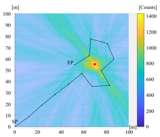 Figure 17 presents the results. The red dot is a radiation source, and the black line denotes the movement trajectory of the robot. The paths were manually determined. The 5.7 MBq source was placed, and the robot continued the measurement until the number of incident events exceeded 30 counts. The robot’s movement speed was assumed to be 1 m/s.