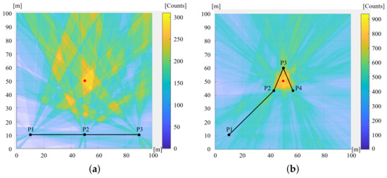 Simulation results of dispersed multiple radiation sources: (a) The results obtained when the threshold was set to 5000 (b) The results obtained when the threshold was set as 2500. It was confirmed that the measurement path significantly depends on the setting of the threshold required to switch the principal component vector.