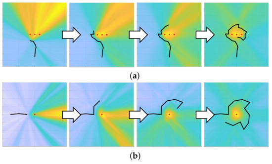 Series of simulation results: (a) the results in Section 3.1.2. (b) the results in Section 3.1.1. The red dot depicts a radiation source, and the black line is the determined path with the proposed method.