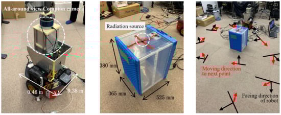 The mobile robot was stationary for 10 min at each measurement point, and measurements were performed using an all-around view Compton camera. After measurement was completed at each point, the reconstruction of the radiation source distribution was performed via simple back-projection. Then, PCA was performed based on the reconstruction results to determine the next measurement point. When the number of incident events did not exceed the threshold, the next measurement point was determined according to the direction of the first principal component. However, the second principal component was selected to determine the next measurement point when the number of incident events exceeded the threshold. The moving distance of the mobile robot at each time step between the measurement points was set to 0.8 m. Figure 19 illustrates the experimental setup. In the right figure, the black arrow represents the direction that the mobile robot faces, and the red arrow denotes the movement direction to the next measurement point, as determined by the proposed method.
