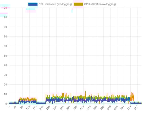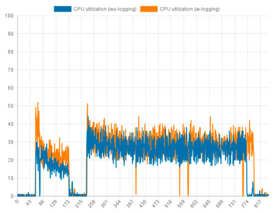 Thus, for the considered example, the use of logging user actions was experimentally established and only significantly affected the load on the server processor (Figure 3) and the database processor (Figure 4), and insignificantly increased the server memory load. The introduction of access control with logging requires the introduction of appropriate resources reserves into the computing complex.