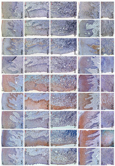 3.1. Selected TLRs and NLRs Localization in Healthy Gingival and Periodontitis Biopsies