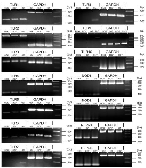 Selected DAMP sensors mRNA detection from HGT, or HGK/HGF primary cultures. By reverse transcription, PCR, TLR1-6, NOD1/2 and NLRP1/2 were detectable in HGT, HGK, and HGF with TLR4 or NLRP2 detectable in some but not all samples investigated (please refer to text and Table 4 for details). TLR7/8/10 mRNAs were only detectable from HGTs. THP-1 cell line was utilized as the positive control for TLR9 mRNA detection. HGF—human gingival fibroblasts, HGK—human gingival keratinocytes, HGT—human gingival tissue.