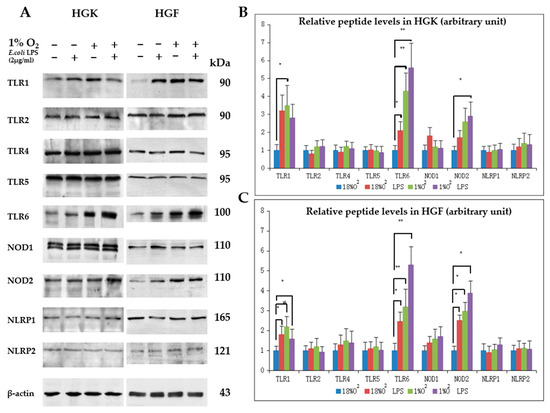 DAMP sensor proteins observable from immunohistochemistry (Figure 1) were followed in HGK/HGF explants in vitro. Both cells were also subjected to 24 h 1% O2 and/or 2 µg/mL E. coli LPS treatment. In brief, TLR1-6, NOD1/2 or NLRP1/2 appeared readily detectable on both cell explants in hypoxia and/or E. coli LPS challenge (Figure 3A). Semi-quantitative analysis of DAMP sensors under various experimental conditions were also reported (Figure 3B,C). In brief, TLR1, TLR6 and NOD2 proteins appeared significantly increased after HGF treated by 1% O2 and/or 2 µg/mL E. coli LPS at 24 h (Figure 3C), while the same appeared observable for TLR6 only on HGK cells (Figure 3B). For the latter, TLR1 or NOD2 peptide appeared significantly increased upon 1% O2 or 1% O2 and 2 µg/mL E. coli LPS at 24 h treatment, respectively (Figure 3B).