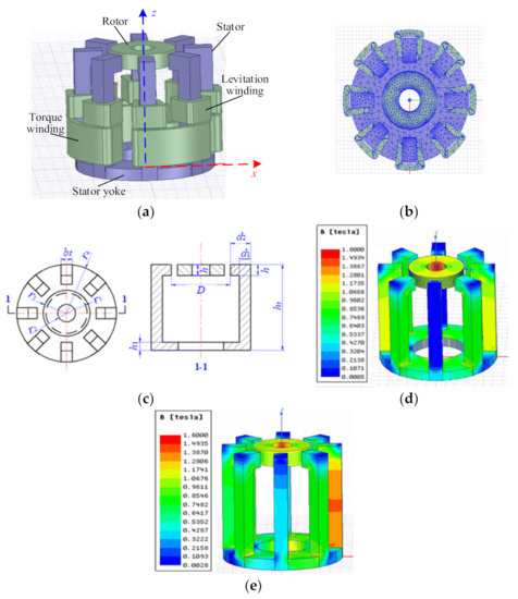 Based on the virtual model, a coarse grid is first used for mesh generation, then the steady-state adaptive mesh is used. As presented in Figure 1b, the grid between different material structures is finer to ensure computation accuracy. Figure 1d,e displays the magnetic field distribution of BPMSM no-load and on-load conditions. For the former condition, the two-pole magnetic flux is symmetrical with the rotor in the equilibrium position. For the on-load condition, the magnetic flux is the combination of the symmetrical quadrupole magnetic field produced by the levitation force winding current and the symmetrical two-pole magnetic flux of the no-load condition. It can be observed that the magnetic density along the +x-axis is obviously larger than that of other parts, verifying a controllable radial suspension force generated along the +x-axis.