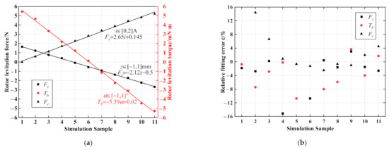 Linear fitting of BPMSM performance. (a) Linear fitting of axial levitation force, tilting levitation torque, and radial levitation force; and (b) relative fitting error of Fz, Tb, and Fr.