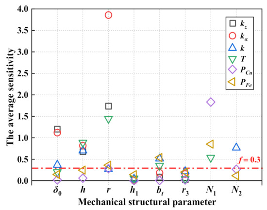 The purpose of sensitivity analyses is to screen out structural parameters with a greater impact on the overall performance. According to Figure 5, the sensitivity of different structural parameters to a specified optimized performance are concentrated as values smaller than 0.3. A larger f means that the optimized performance is more sensitive to the structural parameters. To reflect the influence of structural parameters on optimized performance with centralized characteristics, we define the threshold of 0.3 as the dominant index for sensitivity evaluations. The sensitivity evaluation index of structural parameters of BPMSM performance is shown in Table 2 using the + symbol. It can be seen from Table 2 that h and r appear five times with the highest frequency, δ0 and N1 appear three times, bt and N2 appear twice, and the others did not appear. Thus, δ0, h, r, N1, and N2 are selected as the BPMSM mechanical structural parameters.