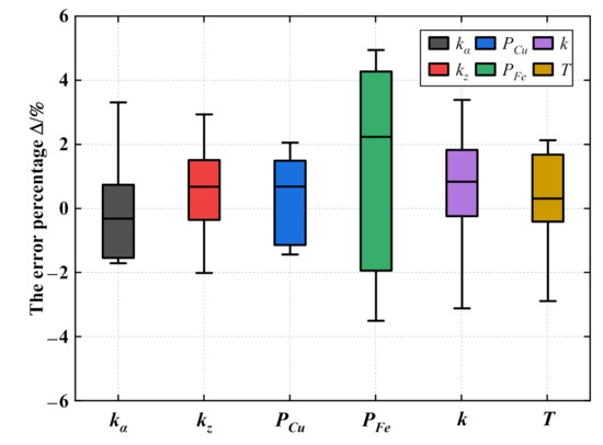 The corresponding weights, ω1, ω2, ω3, ω4, ω5, and ω6 of kα, kz, PFe, PCu, k, and T add up to 1. The calculation results of the weights are obtained using MATLAB, as shown in Table 4.
