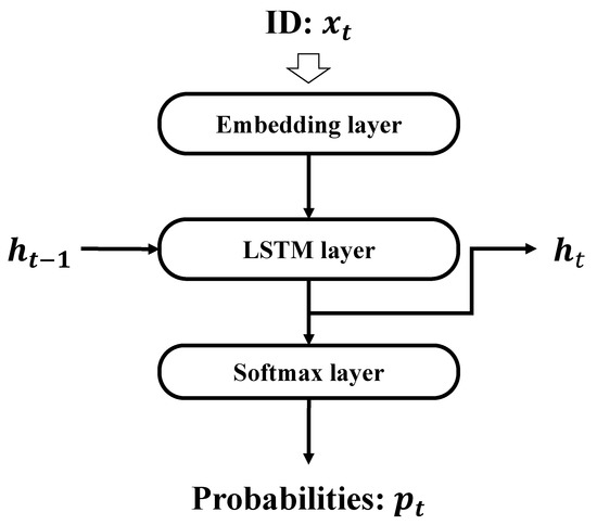 The embedding layer embeds a given input sequence into the vector . Then, the LSTM layer uses the given vector as an input to calculate the hidden output . The hidden output obtained from the LSTM layer is converted into a word-by-word probability distribution by the softmax layer.