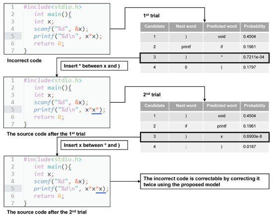 The table on the upper right in Figure 4 lists the prediction results for one application of the proposed model to the incorrect code. The candidate with the lowest probability of occurrence for the next word is the position of “)”, and the proposed revision is “*”. This demonstrates that the model can correctly predict this logic error. In addition, the proposed model predicts “insert * between x and )” from this information. The table at the bottom right of the figure shows the correction candidates when the proposed model is applied a second time to the source code that has already been corrected once. The candidate with the lowest probability of appearance is the position of “)”, and the proposed amendment is “x”. From the obtained information, the overall prediction by the proposed model is thus “insert x between * and)”. Therefore, it is possible to correct all logic errors in this source code by applying the proposed model.