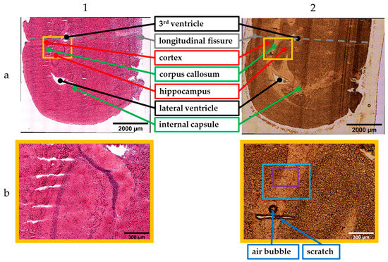 Figure 2(1b,2b) show smaller image sections containing portions of the cortex, corpus callosum, and hippocampus. These stitched images are the results of the local scan using the 5× magnification. These smaller areas can be localized by the orange frame within the global images (Figure 2(1a,2a)). Furthermore, artefacts such as an air bubble and a scratch facilitate the visual assignment within the unstained tissue section (Figure 2(2b)).