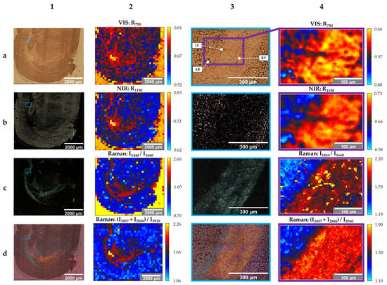 Since the brain was cut in the coronal plane, the tissue section showed symmetric brain structures that were mirrored on the longitudinal fissure (dashed line, Figure 2(1a,2a)). Consequently, it was sufficient to measure one cerebral hemisphere for the global scans. The global scan’s result of the H&E-stained sample is illustrated in Figure 2(1a). The corresponding scan of the unstained sample is shown in Figure 2(2a). Both images provide an overall overview of the cryosections.