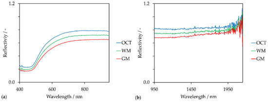 Besides the reflectance spectra of GM and WM, the reflectance spectrum of OCT is shown as well. Since the tissue was embedded in transparent OCT, OCT still surrounds the cryosection and consequently coats the microscope slide (see Figure 2(2a)). Although OCT is a side component within this proof-of-concept, OCT affects the spectral evaluation of the global scans. This is shown in Figure 3(2a). Compared to the few pixels located at the lateral ventricle and the single pixel of the 3rd ventricle that are yellow, the OCT area is rather orange. This confirms that OCT reduces the intensity of the backscattered light compared to the reflectivity of the gold-coated slide without tissue sample. However, reflectivity at OCT is higher than the reflectivity at WM and GM. Due to the 180° back-scattering arrangement, the incident light transmits the sample twice. Forward-scattered light is reflected back by the coated surface. Gold absorbs in the blue spectral range. This is indicated by the drop around 450 nm in each reflectance spectrum of Figure 4a. Reflectivity increases between 500 nm and 700 nm and remains constant from 700 nm to 950 nm. The highest reflectivity of the shown spectra is detected for OCT. GM has the lowest reflectivity in the VIS spectral region. This is in accordance with the color-coding in Figure 3(2a,4a). Pixels in the WM area appear reddish and GM is rather bluish. Artefacts, such as the three air bubbles and the tissue fold, that appear darker in the brightfield images have lower reflectivity values as well.