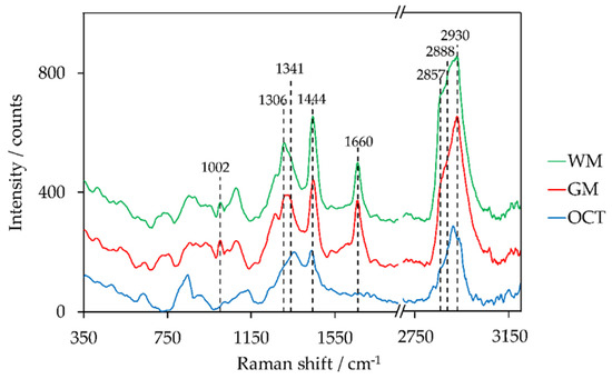 Preprocessed Raman spectra (averaging over 9 spectra) of white matter (WM), grey matter (GM), and optimal cutting temperature compound (OCT), offset: +150 counts (GM), +300 counts (WM).