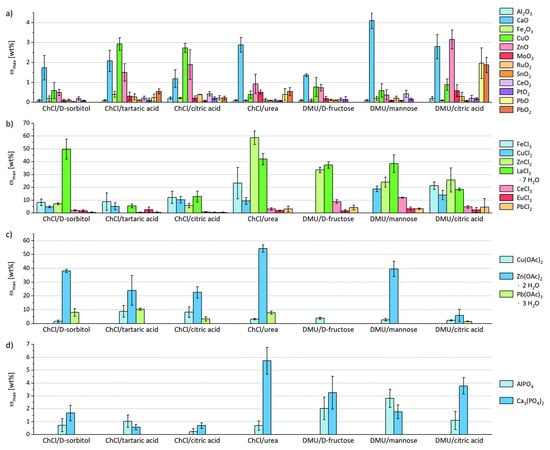 Maximum solubility as the mass fraction ωmax (wt%) of metal compounds in seven different DESs: (a) oxides; (b) chlorides; (c) acetates; and (d) phosphates. The mass fractions represent an average of three independent measurements. Reprinted from Söldner, A.; Zach, J.; König, B. Deep Eutectic Solvents as Extraction Media for Metal Salts and Oxides Exemplarily Shown for Phosphates from Incinerated Sewage Sludge Ash. Green Chem., 2019, 21 (2), 321–328 with permission from Royal Society of Chemistry [].