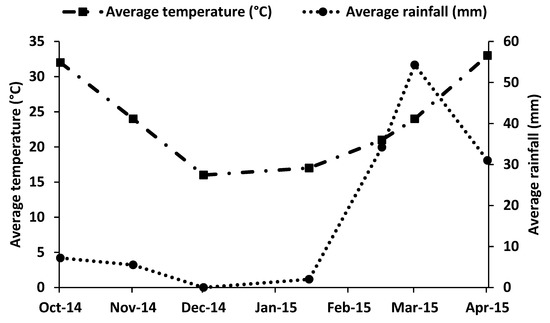 Average temperature (°C) and rainfall (mm) during the cropping season from October 2014 to April 2015.