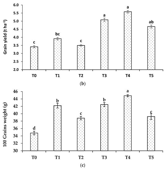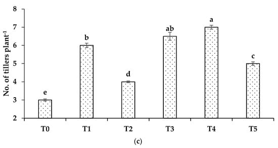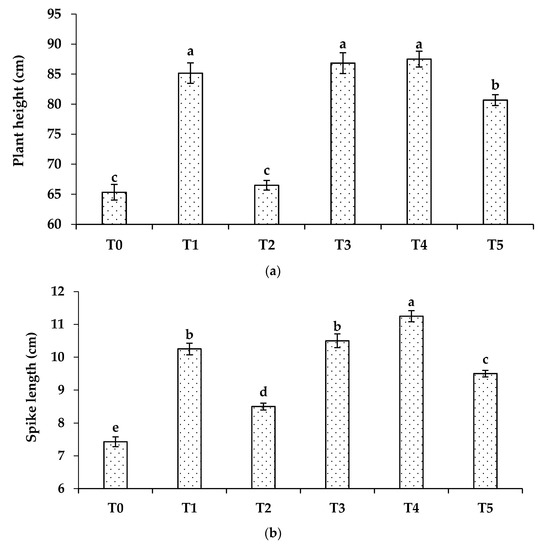 Growth parameters of wheat: (a) plant height; (b) spike length; (c) No. of tillers per plant, grown with different formulations of urea. Where T0 = No Zn; T1 = recommended Zn (ZnSO4); T2 = ZSB; T3 = 1.5% Zn coated urea (ZnO); T4 = 1.5% bio-activated Zn coated urea (ZnO); and T5 = 1.5% Zn blended urea (ZnO). Bars showing the same letters do not differ significantly (p < 0.05).