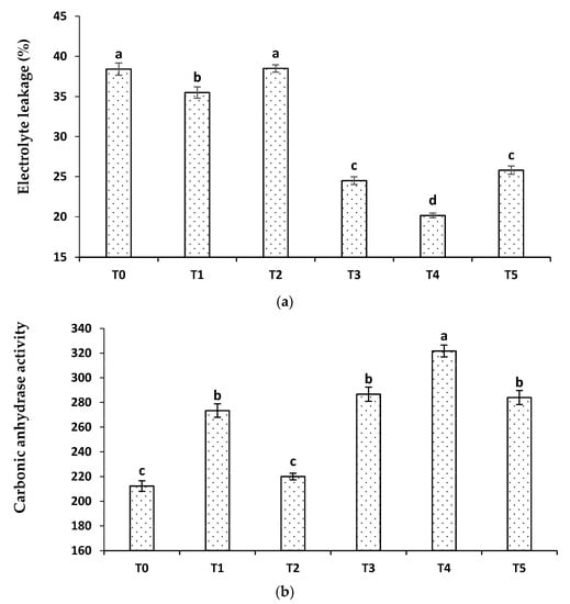 Comparative effectiveness of different Zn formulations of urea regarding electrolyte leakage and carbonic anhydrase activity of wheat: (a) = Electrolyte leakage (%) and (b) = carbonic anhydrase activity. Treatments are as, T0 = No Zn; T1 = recommended Zn (ZnSO4); T2 = ZSB; T3 = 1.5% Zn coated urea (ZnO); T4 = 1.5% bio-activated Zn coated urea (ZnO); and T5 = 1.5% Zn blended urea (ZnO). Means sharing the same letters do not differ significantly (p < 0.05).