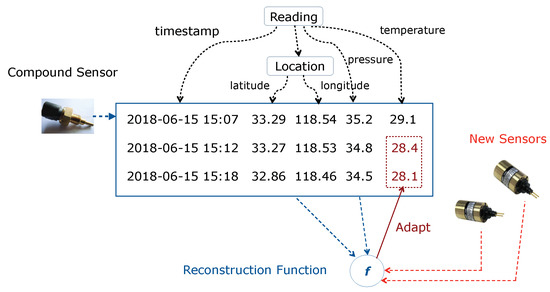 Sensor changes often occur in real-world systems due to replacement of failed sensors, sensor upgrade, energy optimization, etc. [1,5,6]. We use the UUV domain as a real-world scenario: A surge sensor on a UUV may stop working and may be eventually replaced by a new surge sensor. Although the new surge sensor measures the same type of signal, it may introduce a bias different from that of the old one. Throughout this paper, we refer to sensors that are replaced by new sensors as replaced sensors. When sensor change occurs, sensor values from new sensors may not match those from replaced sensors. For example, mis-calibration could exist between replaced sensors and new sensors even when they measure the same types of signals. Furthermore, new sensors may measure additional types of signals that do not exist before the sensor change. Existing literature on sensor changes mainly focuses on change detection but rarely addresses how to adapt to these changes [7,8,9,10]. Typically, human experts are required to examine and respond to detected changes. In order to automatically adapt to sensor changes, we would like to reconstruct sensor values of replaced sensors using the remaining sensors and the new sensors. The underlying assumption is that sensor values from a subset of sensors are correlated, which is often the case in real-world systems [4,11]. For example, temperature, humidity and dew point measured by weather sensors are correlated [12], and any two of them can be used to accurately predict the third one. In general, if our adaptation algorithm can accurately reconstruct the original sensor values, then the reconstructed values can be directly input to higher-layer software without any changes to the software itself. Figure 1 shows an example of weather sensors, continually generating timestamp, latitude, longitude, pressure and temperature values. In the second and third rows, the temperature sensor is replaced by two new sensors. To recover the original sensor values of the temperature sensor, we use a reconstruction function f by leveraging sensor values from the remaining sensors and the new sensors.