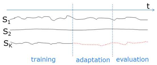 Illustration of training, adaptation and evaluation periods in the BRASS project evaluation. We use data from K sensors (). The training period generates data without sensor change for 2 months. The adaptation period generates data for 1 month, in which is replaced by a different sensor at the beginning. The evaluation period uses data from the next 1 month.