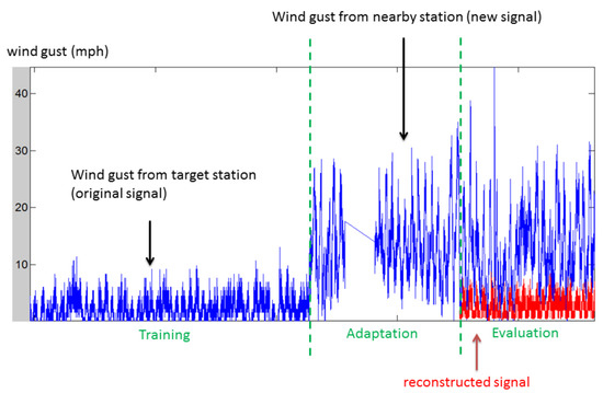 Figure 7 shows the reconstructed wind gust in one random test. The blue curve represents the wind gust from a target station and a nearby station. The red curve represents the wind gust after adaptation, which was much more similar to the original signal in the training period.