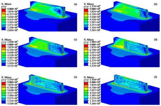 Figure 2 shows the evolution of the stress field in which laser fuses are deposited and are thin-walled; Figure 2a–e are cloud maps of the stress field distribution of the cladding layer at the end of the layer 1 to layer 5 scan. From these pictures, when the number of forming layers is low, it is due to the low substrate temperature. After each layer of sedimentation, there is a large residual stress, and as the number of sediments increases, the substrate is fully warmed up and the residual stress generated by the front layer is released when the back layer is deposited. Thus, with an increase of cladding layers, the stress decreases and the distribution becomes more uniform.
