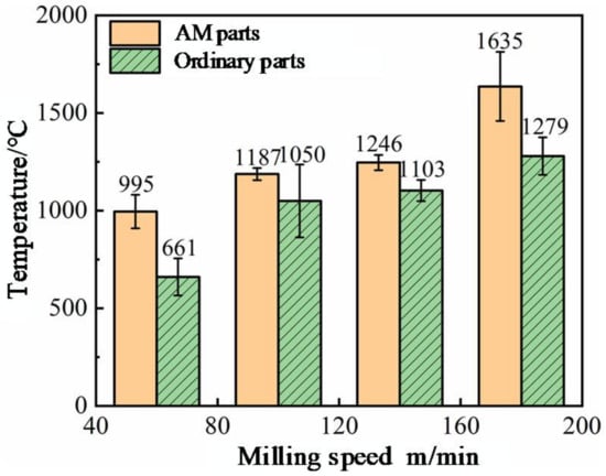 Cutting temperature of forged and additive Ti6Al4V at different milling speeds.