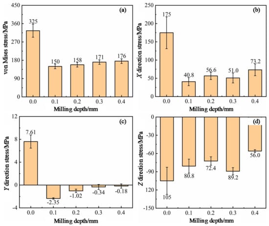 Figure 6 compares the residual stress changes of milling surfaces at different milling depths, with other parameters as constant and considering a milling depth of 0mm as the size of the residual stress of the original face. Figure 6a presents a comparison of Mises stress; it shows that the maximum pull stress of the original face is 325 MPa after milling and the maximum tensile stress is 176 MPa. Where the milling depth is 0.1 mm, the residual stress drop is the largest, reduced by approximately 54%. By observing the influence of milling depth on surface residual stress, it can be found that the surface residual tensile stress increases as the depth of milling increases. As can be seen from Figure 6b–d, milling has a significant impact on surface X direction and Y direction stresses, with the largest decreases being 77% and 131%, respectively. The effect on Z direction stress is weak, with the biggest drop being about 47%. At the same time, the X direction, Y direction and Z direction stresses of the milling surfaces as a whole show the trend of gradually decreasing the pull stress as the milling depth increases towards the pressure stress.