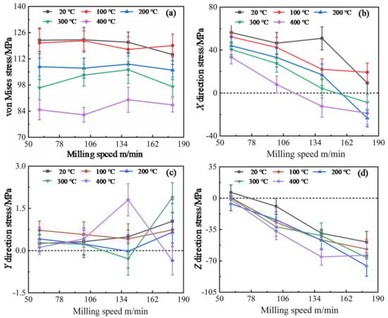 Residual stress of milling surface under different initial temperatures and milling speeds: (a) von Mises stress; (b) X direction stress; (c) Y direction stress; (d) Z direction stress.