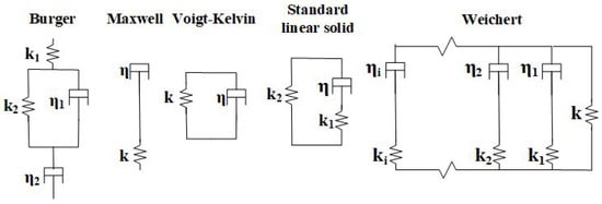 The response of a rubber material can be obtained from rheological models. Linear viscoelastic materials can be represented by combinations of springs and dashpots. The most common ones are the Maxwell and Voigt–Kelvin models [4] which use springs and dashpots connected in series or in parallel, respectively (see Figure 1). The standard linear solid (SLS) is an upgraded rheological model in which an extra spring is added in parallel with the Maxwell unit to allow for an accurate representation of a larger group of polymers [5]. Additionally, the Weichert model offers a relaxation spread over a longer period by using a single spring in parallel with several Maxwell units [6,7]. Xu et al. [8] proposed a non-linear rheological model to offer better accuracy in simulating the material’s relaxation modulus and viscoelastic responses. A logistic-type function approximation was proposed by [8] to simulate the viscoelastic response of spring–dashpot networks. Another recent study employed a combination of a generalised Maxwell model and a relative fraction derivative model to reproduce viscoelastic material behaviour [9].