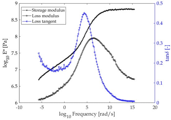 By definition, the modulus of a material is considered as the overall resistance of the material to an applied deformation. Due to its viscoelastic nature, the rubber modulus is split into elastic (storage), , and viscous (loss), , components, denoting the ability of the material to store and dissipate energy as heat, respectively. The real and imaginary components of a viscoelastic modulus are collectively referred to as the material’s complex modulus. Equally important is the loss tangent or , which is defined as the ratio of energy loss to energy storage. The area near the peak value denotes high energy loss and is considered as the area where the tyre is designed to be operating most of the time. While spring–dashpot-based analytical models are useful for representing the physics of viscoelastic materials, the experimentally measured complex modulus as a function of excitation frequency is often used instead. In the case of rubber, the complex modulus is shown to be strongly linked to friction [13,14]. Figure 3 shows the typical complex modulus of a rubber used in tyre manufacturing.