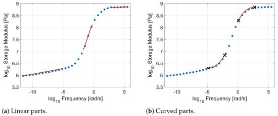 The first model proposes a piece-wise fitting of both the storage and loss moduli using polynomials. As a first step, the two moduli curves (storage and loss) are divided piecewise into sections that will be described by different polynomials. Typically, both the storage and loss moduli curves include regions that can be described by linear functions, as shown in Figure 4a. These linear functions are estimated first using least squares fitting of all data points between the start and finish of each straight line. Linear regions are typically connected via higher-order polynomials—see Figure 4b. The requirement for any non-linear section is continuity up to—and including—the first derivative with the preceding and succeeding curves. In this context, greatest flexibility is offered by fourth-order polynomials whereby continuity at the start and finish points offers four equations for four parameters. A fifth equation is obtained by requesting that the function passes from a selected midpoint between the start and finish points. A pair of typical first and fourth-order equations used in the process is shown in Equation (9), below. The superscript i indicates the number of the piece-wise curve, with counting starting from the left of the frequency range. This method offers robustness against global optimisation methods and very easy tuning.