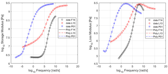 Several published moduli from the literature were used to assess the quality of fitting of the polynomial method. The storage and loss moduli, and the loss tangent, were fitted separately, and the relevant coefficients are provided in Table 1. For all three materials, three linear parts were combined with two fourth-order polynomials, to obtain the overall curves. In Table 1, any subscript indicates the role of the parameter in Equation (9), and a superscript indicates the sequential number of the respective linear or fourth-order polynomial. Clearly, any two of the three complex modulus curves are sufficient for fully describing any tested material.