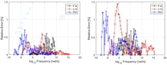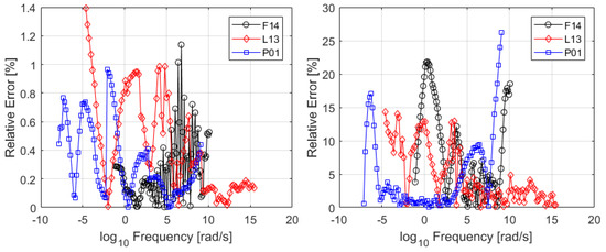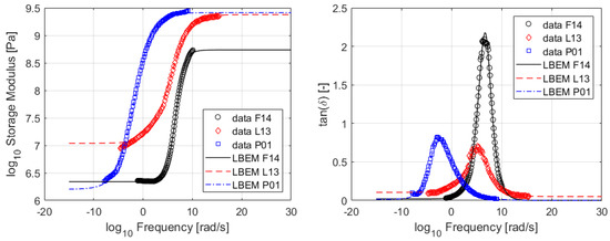 Figure 7 shows a comparison between the measurements and the fitted LBEM models. The results are very satisfactory, as the formula is able to describe all the measured characteristics and is continuous at all times. From Figure 8 it can be appreciated that the relative error for the LBEM is higher than that of the polynomial formulation, as expected. This is because the LBEM approach uses a generic formulation with fewer parameters that can, however, be easily linked to the typifying quantities of the data. For the storage modulus the maximum relative error increased to . The loss tangent shows a higher error of up to , but such discrepancies happen at a limited number of discrete points.
