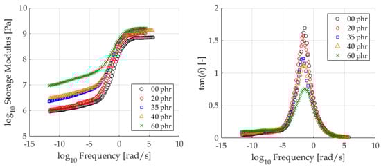 We used the data published in [20] to study the effect of different concentrations of CB (carbon black) on the DMA data, and by extension, the effects on the identified parameters from both formulations. Five SBR compounds with different parts phr (per hundred rubber) of carbon black, ranging from 0 to 60 phr, are shown in Figure 10. Both models were able to fit the curves with a maximum normalised root mean squared error of for the LBEM formulation and for the polynomial formulation. From the raw data it can be seen that as the phr of CB increases, so does the storage modulus in the rubbery (low frequency) region. The storage modulus also increases with the phr of CB in the glassy (high frequency) region, albeit at a reduced rate. The peak of the loss tangent is broadly inversely proportional to the concentration of CB.