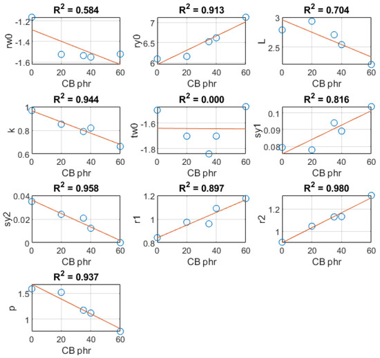 From Figure 12 it can be observed that the parameters , k, , , and p of the LBEM model have R-squared values equal to or higher than , indicating a high level of correlation with the carbon black concentration. As expected from the raw data analysis, the parameter that controls the vertical shift of the storage modulus shows a high correlation. However, the parameter k that controls the logistic rate of increase or steepness of the curve also shows a high correlation, and this was not easy to spot from a visual analysis of the data. In addition, as indicated from the visual analysis of raw data, the parameter p that controls the bell function peak value shows a clear correlation with CB concentration. The loss tangent parameter that controls the bell function’s vertical shift at high frequencies after the peak, together with and that determine the bell’s rate of increase at low frequencies and high frequencies, respectively, also have R-squared values above .