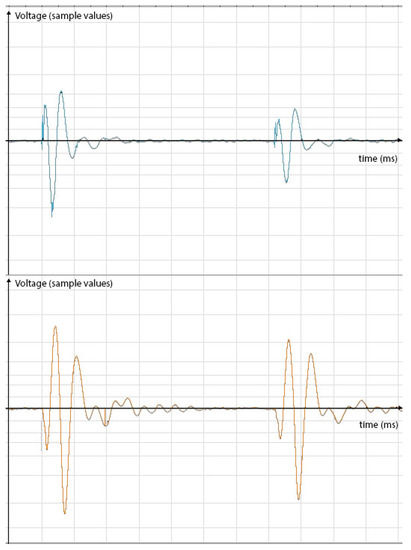 Typical acoustic waveform from tapping the Mid-Left location: Top waveform—Top microphone (blue), Bottom microphone (red). Every tick on the horizontal axis is 10 milliseconds.