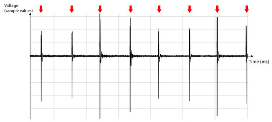 Signal peaks detected in the acoustic signal.Every tick on the horizontal axis is 500 milliseconds.