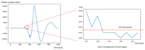 To facilitate feature extraction, we determine a time window around the detected impulse, distinguishing and excluding it from regions of silence or noise. Starting from the detected peak, an empirically determined time buffer is applied backwards to include the start of the impulse. ZCR across a sliding window is used to identify the start of the impulse: the start of an impulse is associated with a low ZCR value as shown in Figure 5, where we apply an empirically determined ZCR threshold of 0.015.