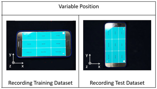 Several experiments were conducted with the movement data and acoustic features extracted from the audio samples. In the first investigation, named Movement Data Experiment, movement data is partitioned into five sets with four sets used to train the classifier and one set reserved for tests. The process is repeated five times and the designated test set is rotated in each iteration. In the second investigation, named Device Orientation Experiment, the device is relocated and rotated 90 degrees (Figure 8) between the training and test sessions and the movement data is used to identify the touch input location. In the third investigation, named Acoustic Feature Experiment, a classifier is trained to identify the touch input location associated with the audio sample. The full touchscreen surface is tested in the experiment and the device relocated and rotated between training and testing sessions to simulate a realistic user-input scenario. Finally, in the fourth investigation, named Reduced Touch-Input Area Experiment, the touch input location is reduced and the classifier is trained to evaluate audio samples from the reduced touch input area under realistic conditions where the device is relocated and rotated between training and testing sessions.