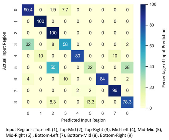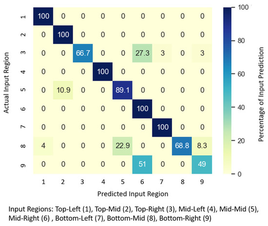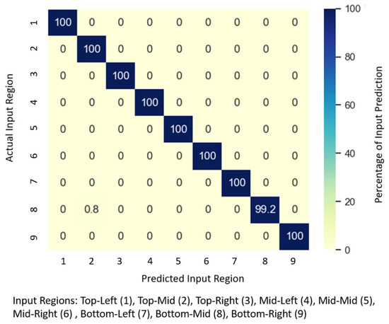 The validation experiment successfully identified the touch input location with high accuracy (99%) using the cross-validated movement dataset, similar to the results reported by [9]. The confusion matrix is shown in Figure 9 (correct classification and misclassification indicated in percentage).