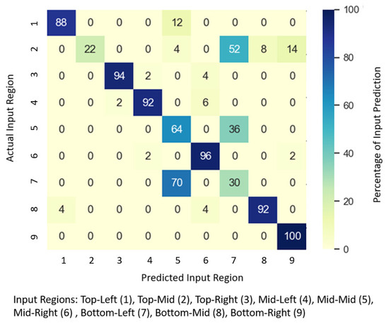 Unsurprisingly, a reduction in the effective touch input area sees a decrease in accuracy with the trained classifier. However, the model is still able to predict the touch input locations with an accuracy of 78.8%, a decrease of just 7.4% from the previous experiment. Touch input locations are now constrained within a smaller area, thereby increasing intra-group variance while decreasing inter-group variability due to increased touch input proximity. Additionally, touch input locations are now further from the upper microphone and hence suffer from poorer signal-to-noise ratio, thereby reducing distinguishing acoustic features, thus reducing performance as seen from the somewhat higher misclassification rate of the middle row (47% of misclassification for middle row) of touch inputs (cf. Figure 1b) in Figure 15.