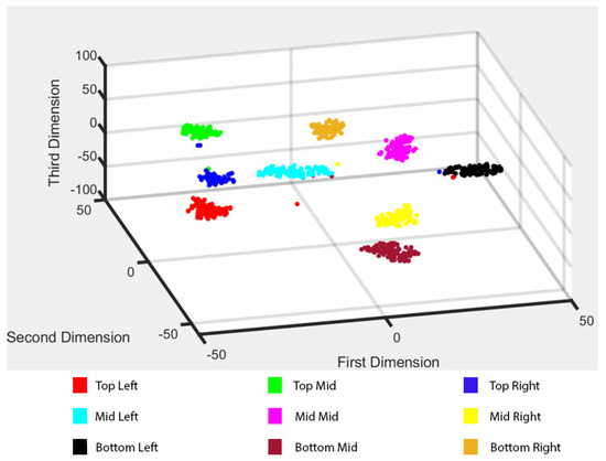 In this figure, acoustic features extracted for a given touch input location are colored according to the location label. The t-SNE scatter-plot reveals clear dimensional separations based on acoustic characteristics. Figure 14 also highlights the chances of misclassification of touch input samples in each location with physically adjacent regions having a higher probability of misclassification. Note also a few stray points of red and blue near the cluster of black: this may reflect the possibility of misclassification attributed to chance similarity of the acoustic signals collected.