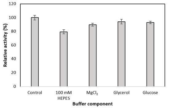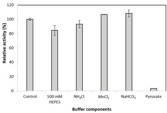 To ensure a successful coupled reaction, the effects of GDH (the regeneration enzyme) reaction conditions on the activity of MDH* (the production enzyme) were examined. The highest reduction in MDH* enzymatic activity was caused by a decrease in HEPES buffer concentration from the standard 500 Mm HEPES in MDH* assays to 100 Mm HEPES in GDH assays; the activity of MDH* was reduced by 20% (Figure 2). The majority of enzymes require only moderate ionic strength, typically ranging between 50 and 200 Mm, but this is not the case for thermophilic enzymes which require buffer concentrations up to 1 M [15]. The observed decrease in activity is therefore likely due to the reduction in buffer capacity which, along with any added components, can reduce the obligatory enzyme activity [16]. Aside from HEPES, the addition of other GDH assay components such as MgCl2, glycerol, and the GDH substrate, glucose, did not reduce MDH* activity by more than 10% (Figure 2).