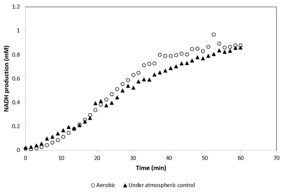 MDH* activity assays were carried out under 15% CO2 and 5% O2 atmospheric conditions; therefore, GDH activity was assayed under atmospheric conditions required by MDH* and activity levels of GDH were measured via the concomitant production of NADH from the oxidation of glucose to gluconate. After 60 min, there was no significant difference between the amount of NADH produced by GDH assayed under aerobic conditions and GDH assayed under atmospheric control (Figure 3). From these findings, it was concluded that GDH is a suitable cofactor recycling partner and its reaction components do not drastically inhibit the activity of MDH*. It was concluded that GDH can be utilized effectively under altered atmospheric conditions as per the requirements of MDH*.