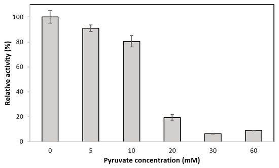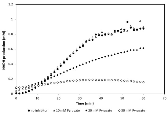 The presence of pyruvate had a substantial negative effect on the activity of GDH (Figure 4). The effect of adding pyruvate at concentrations of 0–60 mM to the standard GDH assay buffer was therefore examined. NADH formation was recorded over 2.5 h and the relative activity of GDH was calculated (Figure 5). As shown in Figure 5, pyruvate concentrations above 10 mM had a significant effect on the activity of GDH and reduced it by over 50%. This was further explored by following NADH production in the first hour of the experiment with pyruvate concentrations ranging from 0–30 mM. Figure 6 shows the effect of different pyruvate concentrations on the activity of the GDH during the first hour of the experiment, whereby concentrations of <10 mM of pyruvate had no significant effect on the reaction.