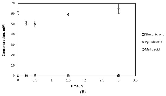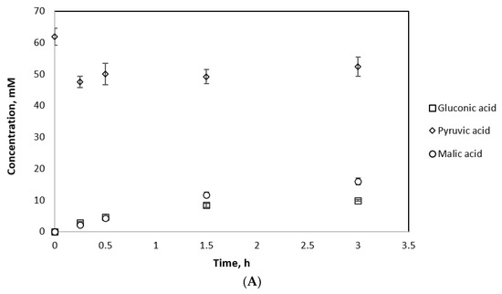 To detect malate by HPIC, 2 mL cascade reactions were set up and monitored via plate reader, comprising 13.2U GDH and 3.3U MDH* under optimal reaction conditions (65 °C, 5.6% O2 and 12.5% CO2). The reactions were initiated by the addition of NADH. All experiments were carried out in triplicate under the same conditions for different periods of time. An MDH*-only reaction was run as a control (Figure 7B). The gluconic and malic acid yields from the cascade reaction were significantly higher than when MDH* was used alone (Figure 7A). As a result, 15.96 mM malic acid and 9.94 mM gluconic acid were produced by the cascade reaction after 3 h compared to 0.309 mM malic acid from the MDH*-only reaction. Notably, 2 mM malic acid was produced by the dual enzyme system after 15 min (which is higher than the malic acid yield by MDH* alone after a reaction time of 3 h) and another high-value chemical, gluconic acid, was additionally produced by the cascade system from glucose and NAD+.
