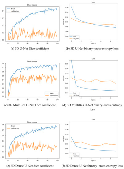 In Figure 3, we depict the learning behavior of the models tested by considering the Dice coefficient that we obtained for slab-based approaches, and the binary–cross-entropy loss for box-based ones (with a different sliding window averaging). For the sake of clarity, we chose these configurations to expose the accuracy and loss curves, but the following observations concern the other volumetric setups.