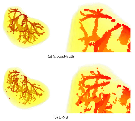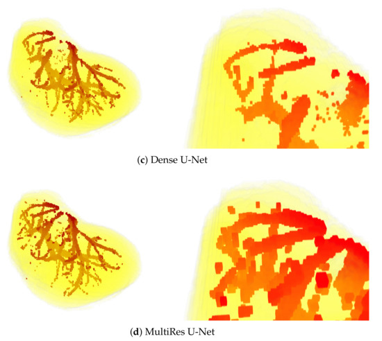 The above observations are also confirmed by the visual results presented in Figure 5. Mainly, the results of the U-Net model are visibly most noisy, with many small regions distant and not connected to the main vessels (see Figure 5b). On the other hand, the best visual representation of the liver vessels is obtained from MultiRes U-Net. From Figure 5d, one can see that that the resulting vessels are larger and more continuous, with the lowest amount of noise. Further, MultiRes U-Net provides the best segmentation of the largest branches. This latter fact is a significant advantage to automatically build the Couinaud representation of the liver, which is commonly used by clinicians of various specialties to describe the locations of hepatic lesions.