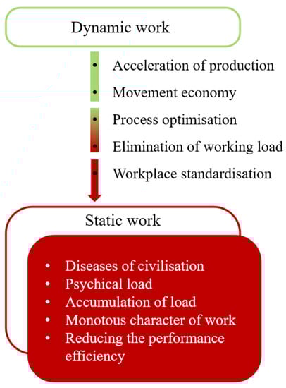Moretti et al. recently published the study, which concentrated on observing the influence of the home office on productivity, work stress, and musculoskeletal problems in the case of employees working from home. Moreover, the acceleration of production, development of technologies or optimization of the workplace, and manufacturing processes force employees to carry out activities with minimal movement (see Figure 1). In the case of manufacturing activities, it is the strictly defined optimal working spaces and non-manufacturing activities which require the sitting working position. The modern human population ceases moving during working but also non-working times. The consequences of such a lifestyle have been well-known for several decades—obesity, cardiovascular illnesses or body posture disorders that indirectly or principally affect the population health [,,,]. Due to the above negative impact on a professional and personal level, it is required to study the dynamization of the work.